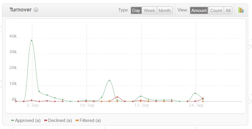 button: the ratio by volume of transactions or by amount of payments, as well as by type of transactions (sale, capture, transfer, etc). Neonpay Payment Gateway also displays statistics on negative activity and earnings.