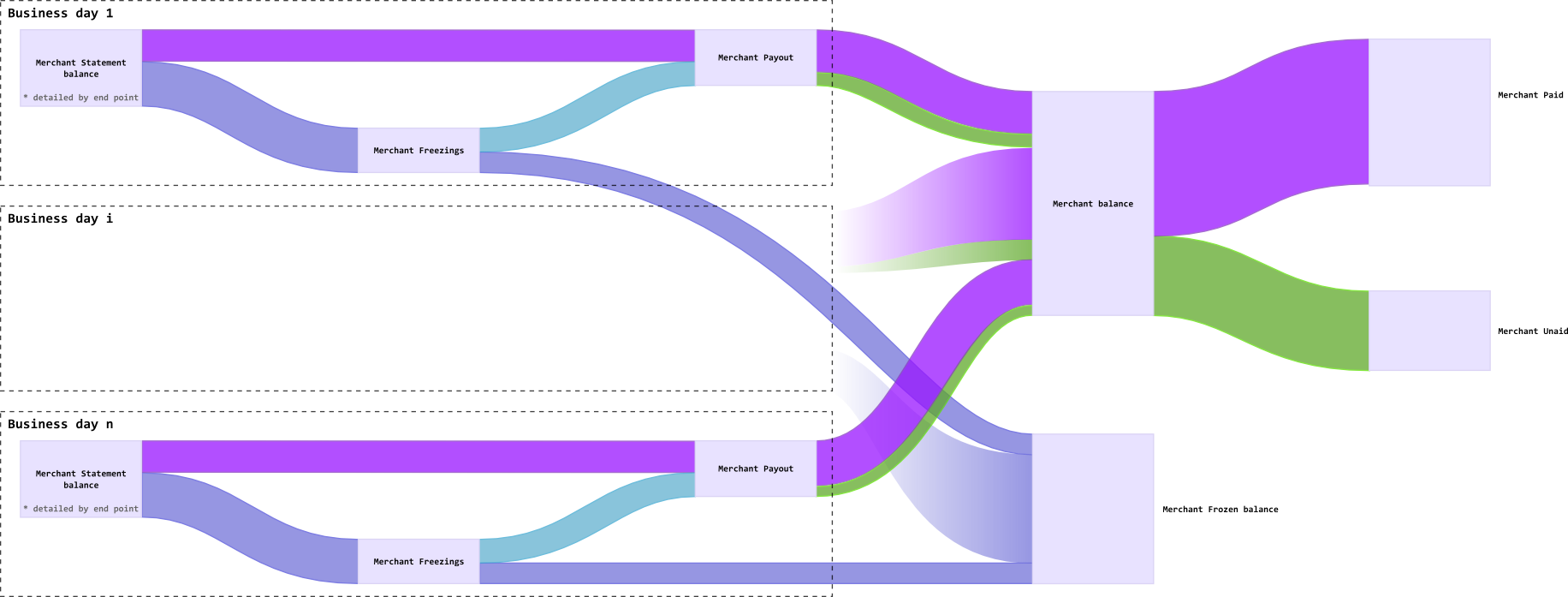 The calculated balance of the current period for each type of user is added to its current balance. The balance is maintained individually for each currency. For merchants, the balance is also detailed by the reseller, if available. The company’s balance sheet is not taken into account. The counterparty’s current balance is defined as the sum of the current balance of all its statements, minus paid and frozen funds.